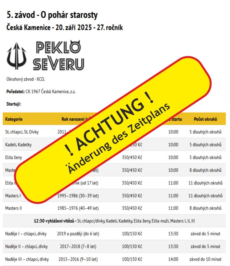wir sind den Rennfahrern entgegengekommen und haben die Startzeiten der Kinderläufe beim letzten Rennen der Serie verschoben, damit sie es von Liberec nach Česká Kamenice vom kollidierenden Rennen rechtzeitig schaffen.